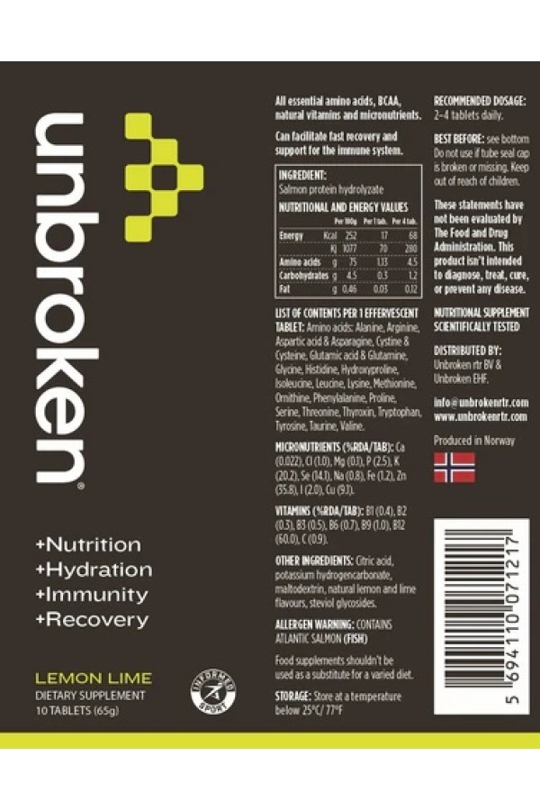 Unbroken® Real Time Recovery is an advanced nutrient solution developed in Norway to help you recover instantly after training. Made from extensively hydrolyzed Norwegian salmon protein, it delivers 9 essential amino acids, collagen peptides, vitamin B12, zinc, and potassium in an ultra-bioavailable form. With a molecular weight of just 374 Dalton, 99% of the nutrients are absorbed within minutes—allowing your recovery to start in real time.